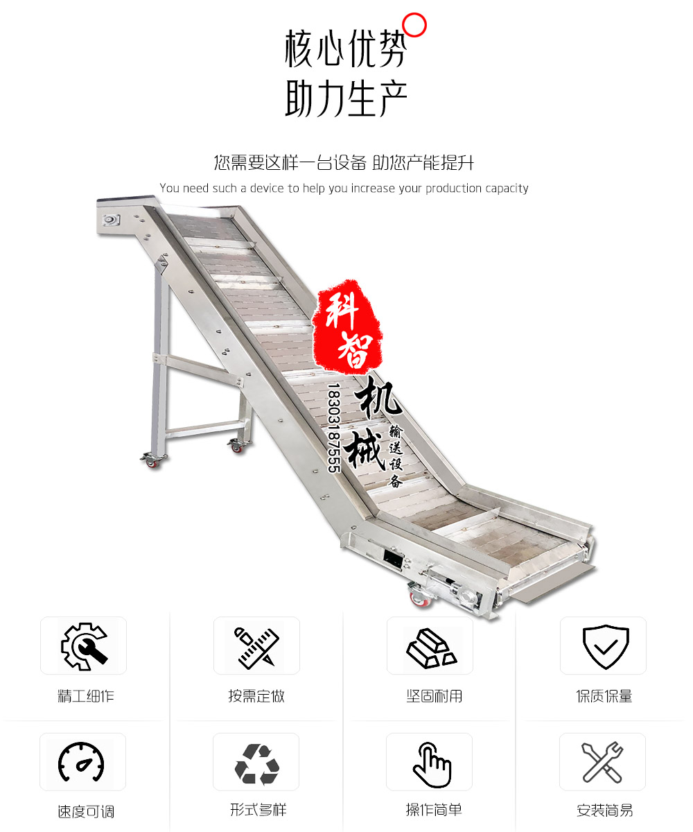 金屬鏈板爬坡機廣泛應用于食品、罐頭飲料、化妝品洗滌產品等行業(yè),它可滿足貴公司所需的自動輸送、分級包裝、耐磨、防腐、結構精密、運行平穩(wěn)。